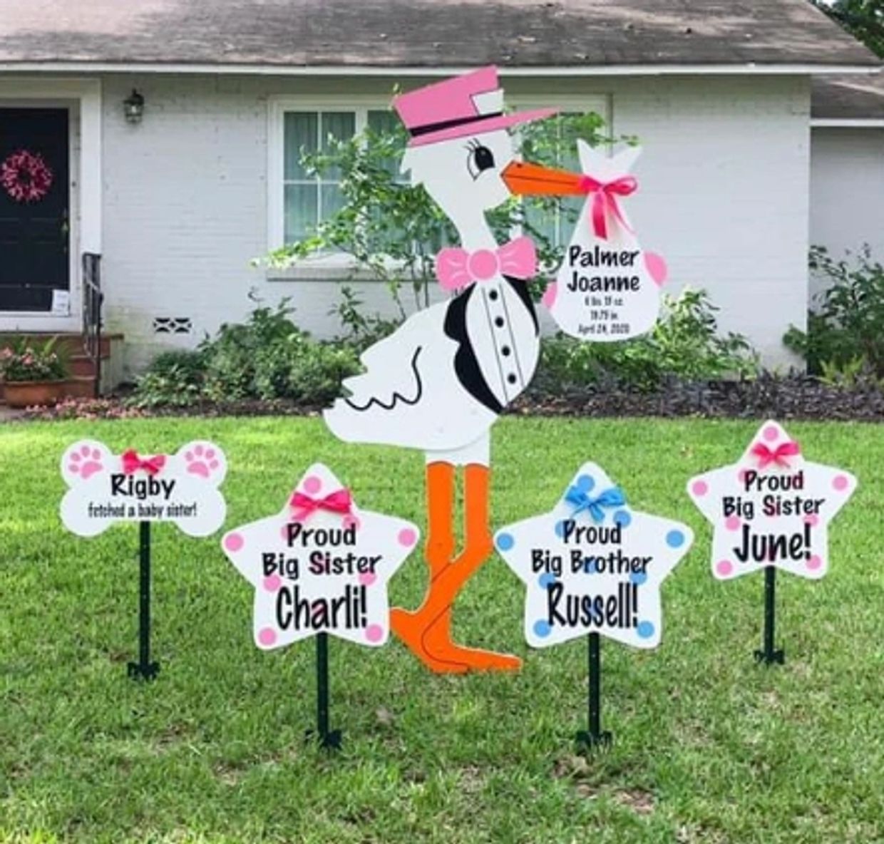 Celebration Storks and More is a new family-owned and operated stork sign rental company serving Laurens, SC and the surrounding areas. We'd love to help you announce your new arrival to your friends and neighbors. We deliver our beautiful 6 foot stork yard signs to help you celebrate your bundle of joy. Celebration Storks and More also offers coordinating yard signs for siblings, grandparents, and pets. Our signs are lovingly customized for your family. All yard signs are offered for a 7 day rental.